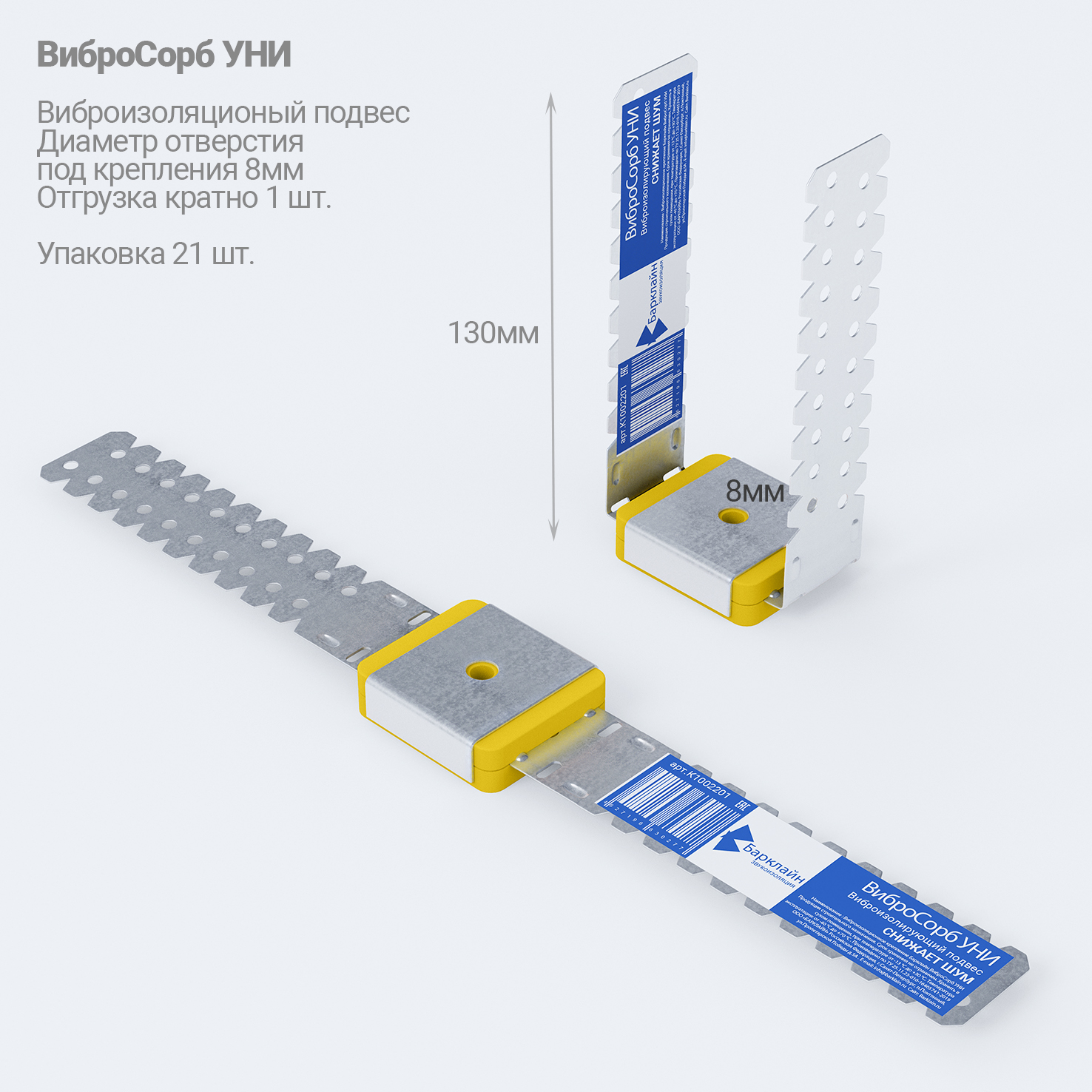 Подвес снабжен крепежной скобой из оцинкованной стали 2мм, благодаря которой подвес УНИ надежно закрепляется на поверхности. ВиброСорб подобран таким образом, что позволит минимизировать сдвиг, осадку конструкции потолка по мере нагружения, что упрощает монтаж, даже тяжелых многослойных конструкций. Диаметр отверстия под крепление 8мм, что позволит вам использовать и другие варианты крепежа.