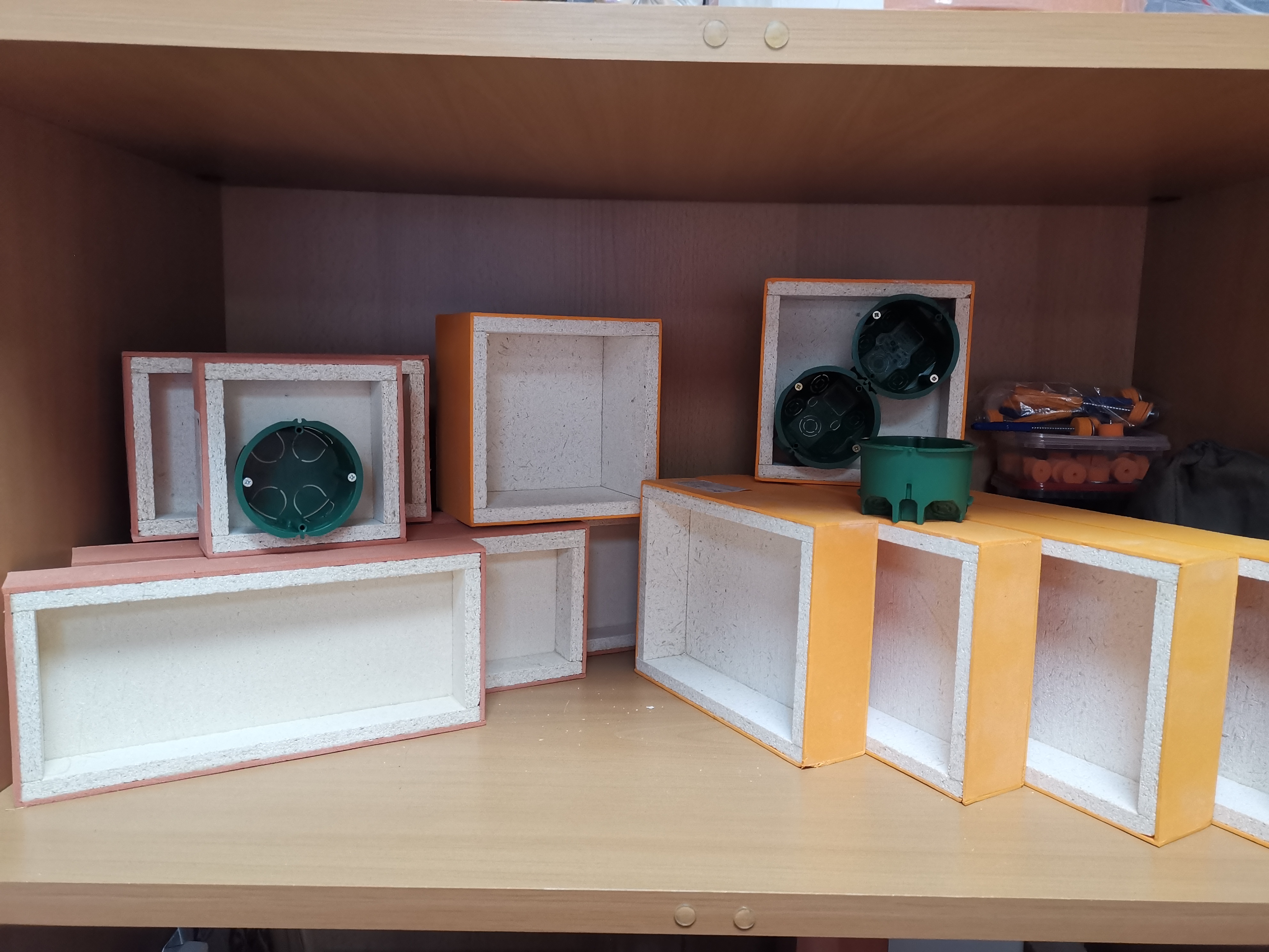 Предназначен для размещения за технологическими отверстиями в звукоизоляционных облицовках стен, потолка, в конструкциях каркасных звукоизолирующих перегородок. Короб устанавливается за местом сквозного пропила облицовки, таким образом звукоизоляционный контур остается замкнутым. Имеет пять типоразмеров от одинарного блока до блока на пять розеток.