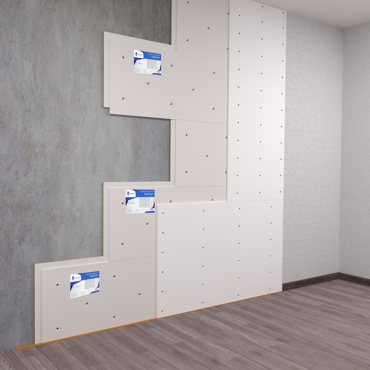 Панель УниПлит 24 ПК – высокоэффективная панель с замковым соединением для однослойной звукоизоляционной облицовки стен, потолка, пола. Монтируется бескаркасным способом на основании, используя специальные крепления для УниПлит 24. В конструкции всего два слоя и минимум монтажных операций. Замки панелей скрепляются герметиком ВиброСорб и саморезами для УниПлит 19мм. Звукоизоляция монтируется в один слой , просто прикрепите панели, поверх покрывается сплошным слоем шпатлевки с сеткой 2х2, либо слой ГКЛ 12,5мм.