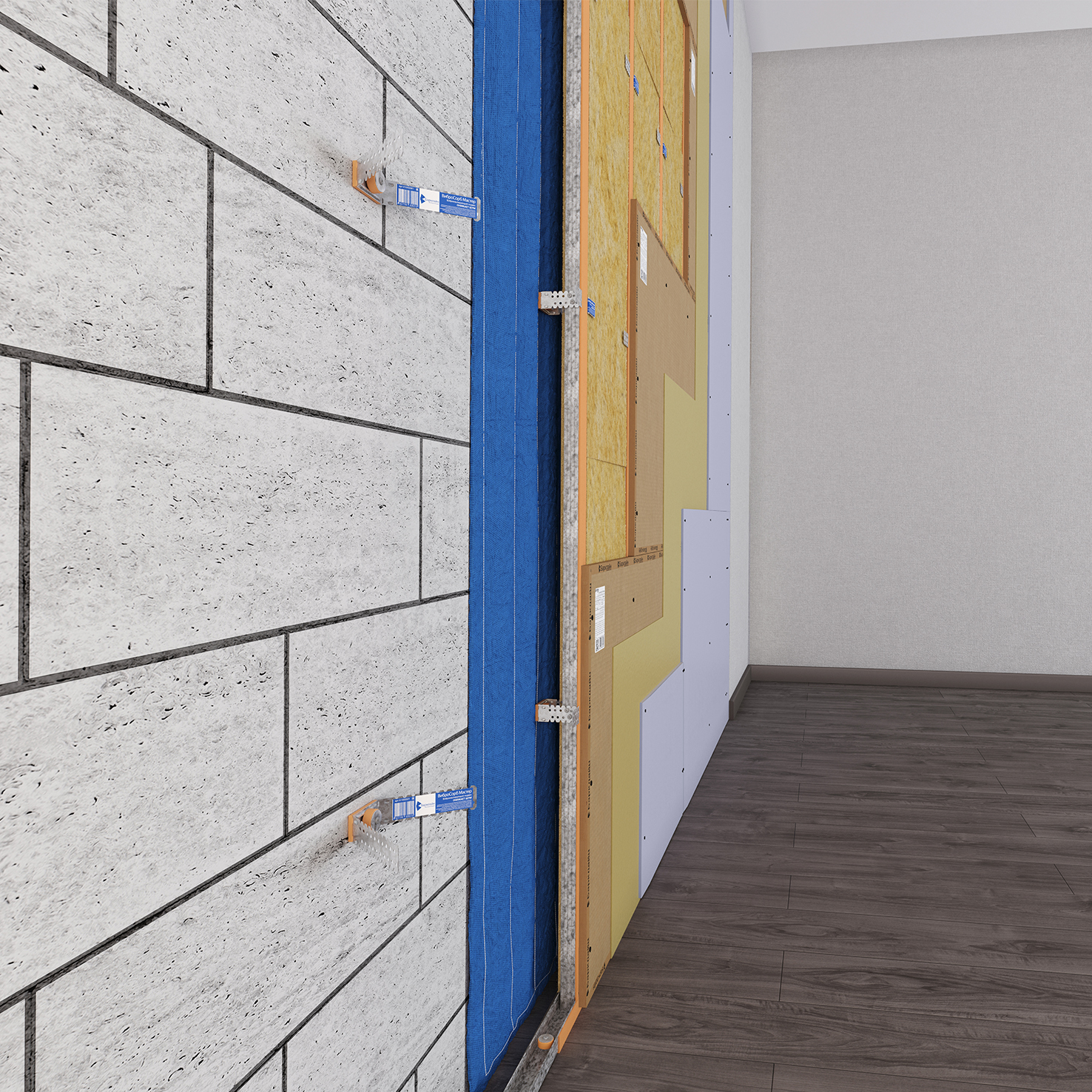 Звукоизоляция стены Базовая Барклайн Кварц Плюс Эффективная система начального уровня, дополнительные преимущества достигаются за счет применения виброизоляционных подвесов ВиброСорб Мастер.