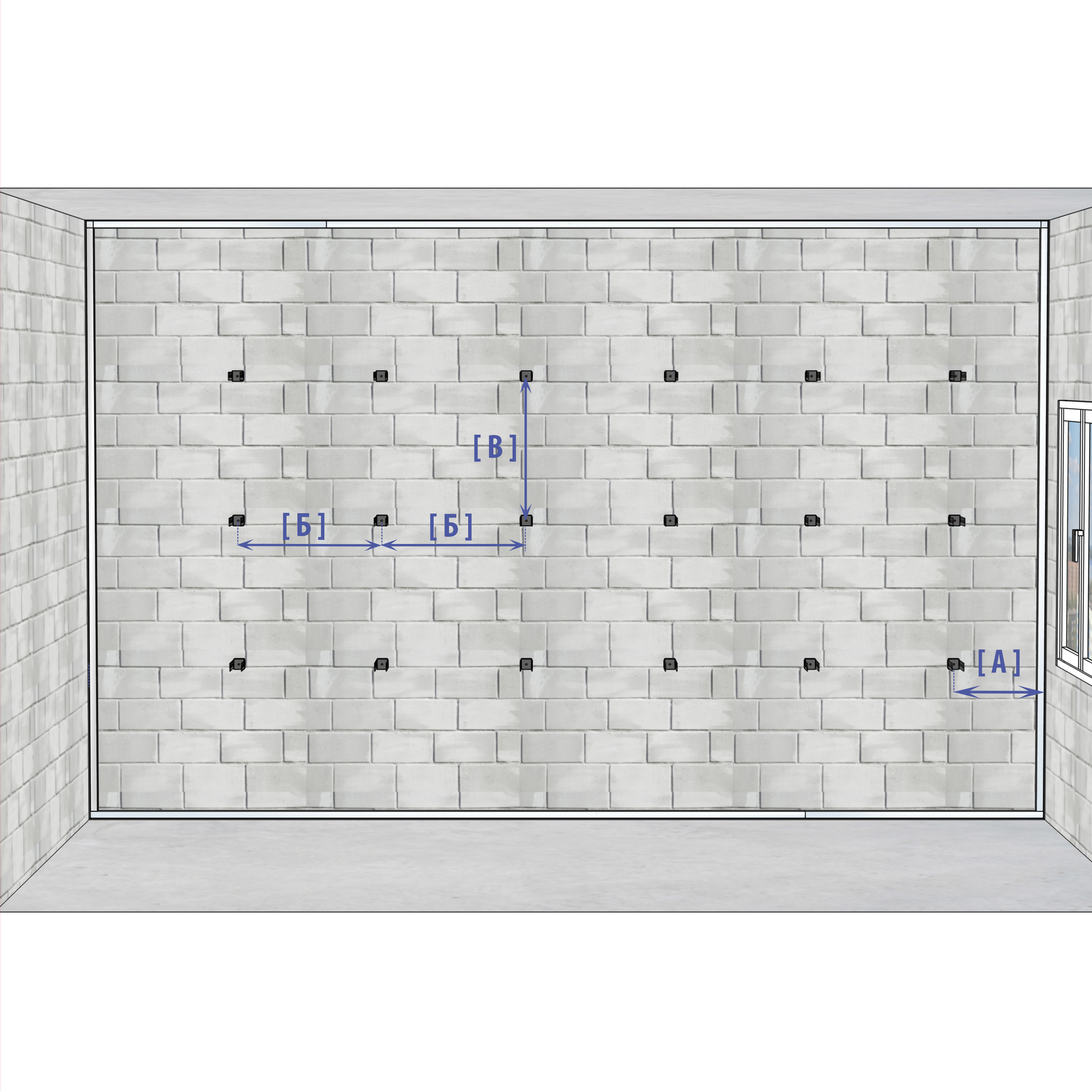 Разметка мест установки виброизоляционных подвесов, направляющих профилей. [A] - от стены до центра подвеса 600мм. [Б] - от центра до центра подвеса 600мм. [В] - между подвесами 400-900мм(при высоте 2,4м нужно 3 подвеса.