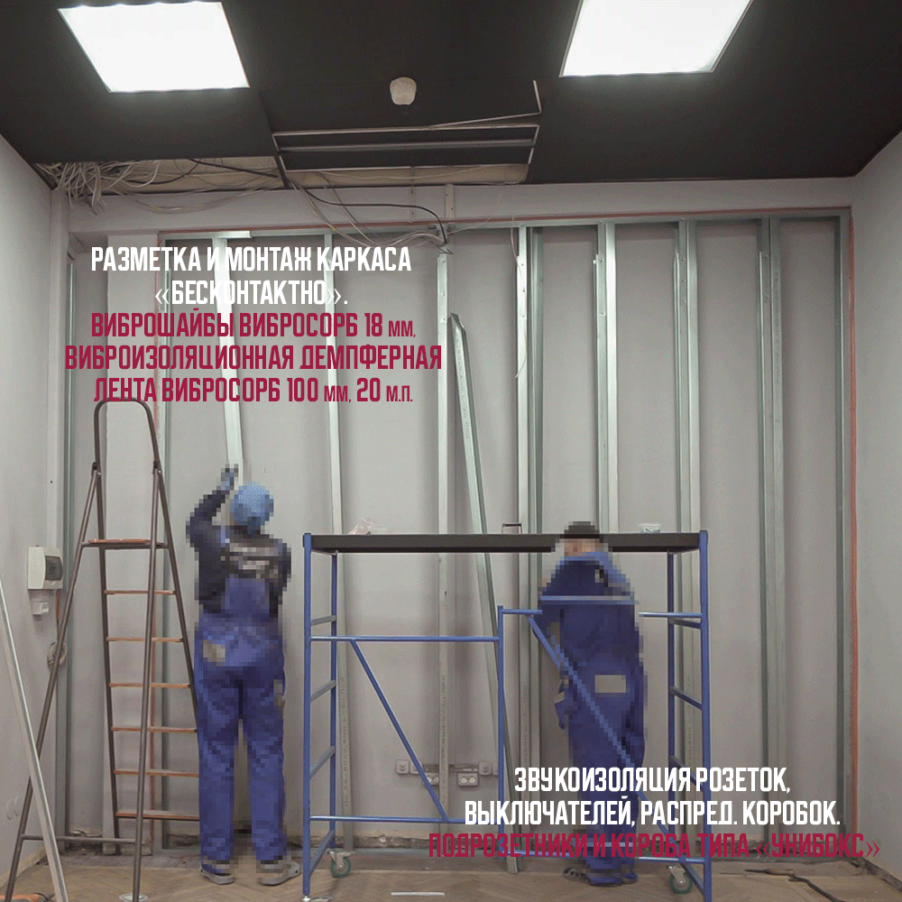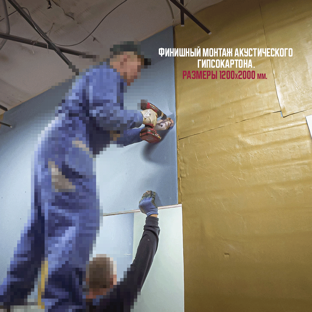 4. Установка звукоизоляционных панелей УниПлит 16ПК 1200х1250х16 мм – тонкая, эффективная панель для звукоизоляционной облицовки стен, потолка, деревянных и металлических каркасов внутри помещений, состоит из гипса строительного, волокон целлюлозы и специализированного демпферного полотна БасАкустик.