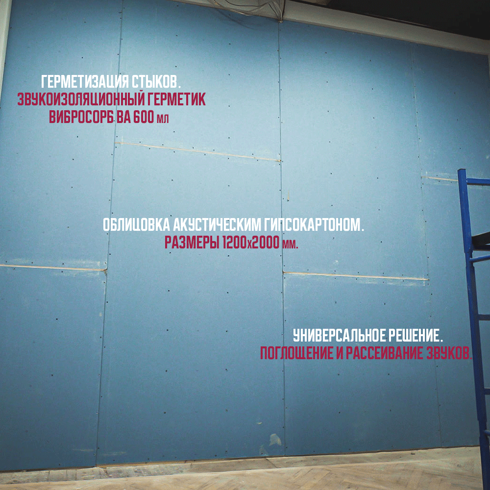 5. Закрепление гипсокартона: завершающим этапом является фиксация листов акустического гипсокартона поверх мембраны и остальных слоев, обеспечивающая финишную гладкую поверхность.
